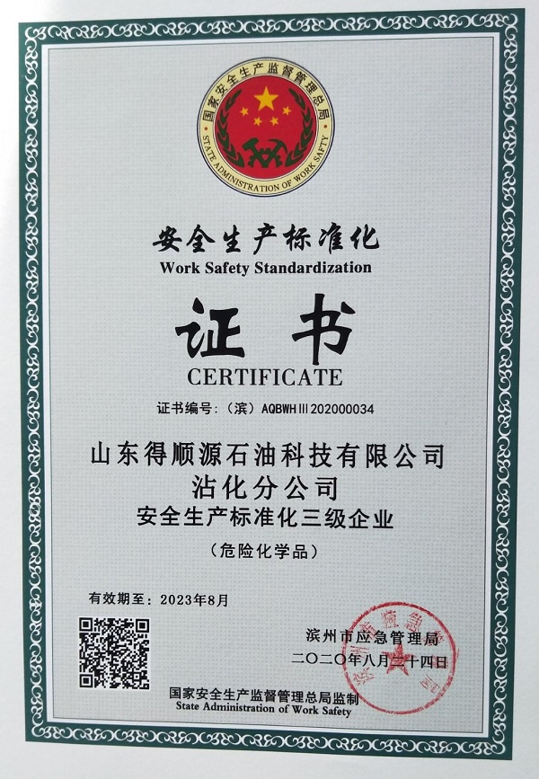 On October 13rd 2020, Shandong Deshunyuan Petroleum Technology Co., Ltd. Zhanhua Branch obtained the certificate of "Three-level Enterprise of Safety Production Standardization" issued by Binzhou Emergency Management Bureau.