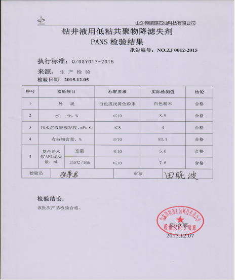 近日我公司歷經兩年時間研發的新型鉆井液用降濾失劑——低粘共聚物降濾失劑PANS,先后在勝利、海南等多個油田現場應用取得成功。該產品不僅解決了高溫高鹽條件下鉆井液濾失量的控制問題,而且避免了對鉆井液流變性的影響,保持了鉆井液流變性的穩定,受到現場鉆井液工程師的高度贊揚。PANS是由AA、AMPS等為主要原材料,以水為溶劑,采用氧化還原引發體系,合成出的兩性耐溫耐鹽型聚合物降濾失劑。該產品不僅作用高效,而且具有很好的熱穩定性,抗溫達160℃以上,抗鹽至飽和,與常用的LV-CMC、LV-PAC相比抗溫能力及降濾失效果大幅度提升,粘度效應更低,應用前景廣闊。