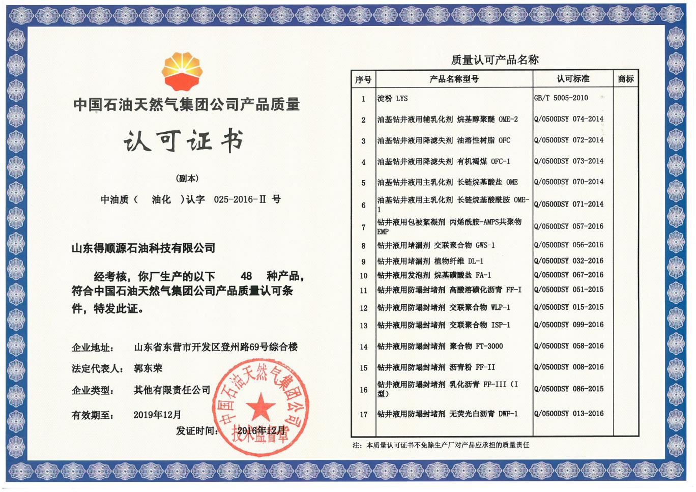 2018年公司新研發的兩個產品:(1)鉆井液用防塌封堵劑 納米聚酯NP-1和(2)鉆井液用降濾失劑 磺酸鹽共聚物DSP-1成功增加到中石油產品質量認可證內。截止目前,公司在中石油產品質量認可證范圍內的產品已經增加至50個產品。