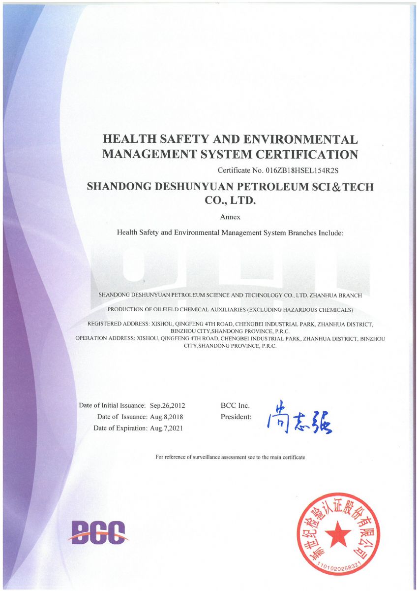 2018年8月,公司順利通過北京新世紀認證公司關于HSE認證的三年換證監督審核,并收到了最新版的中石化和中石油HSE證書。
