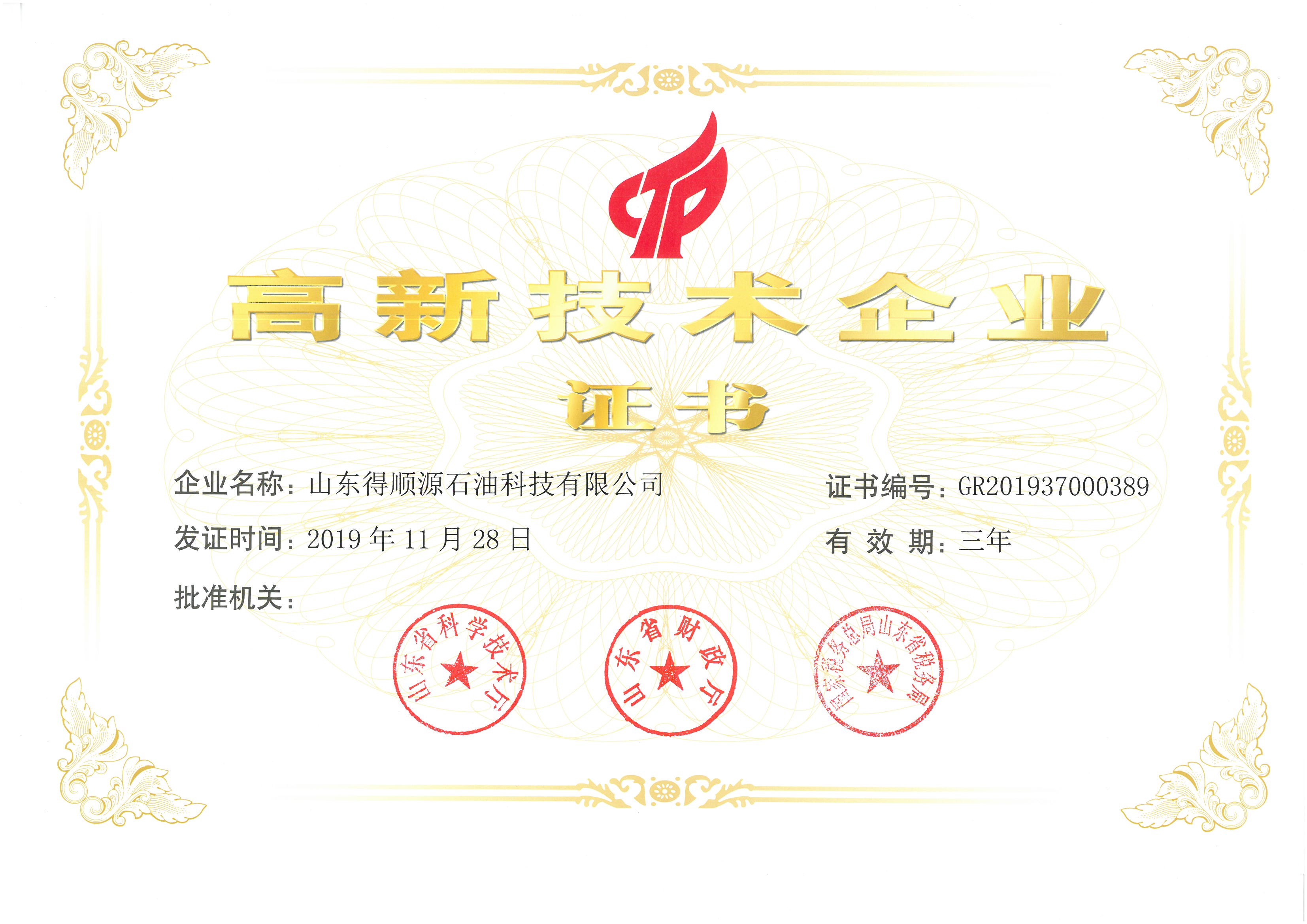 2020年4月30日,我公司順利通過高新技術企業認定,獲得山東省科學技術廳、山東省財政廳、國家稅務總局山東省稅務局聯合頒發的“高新技術企業證書”。